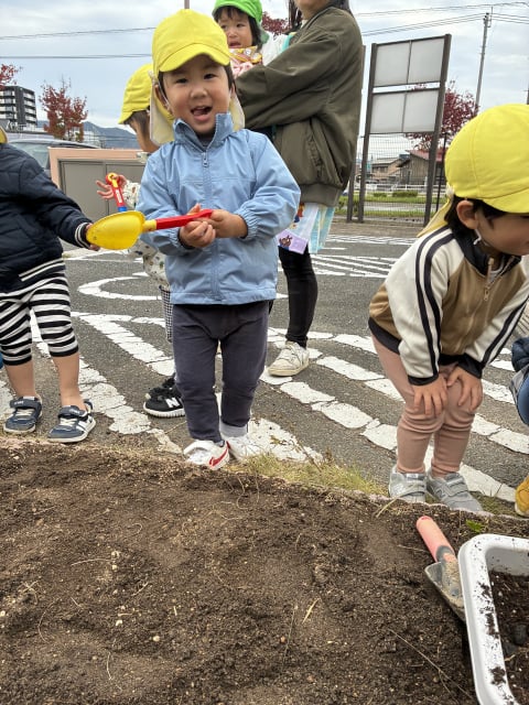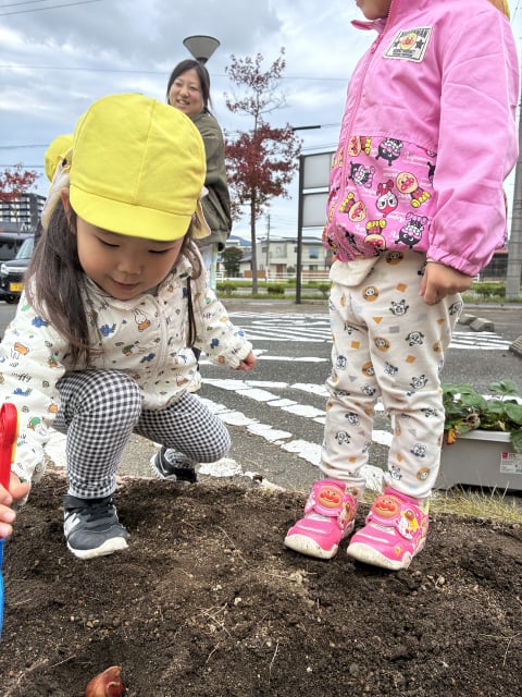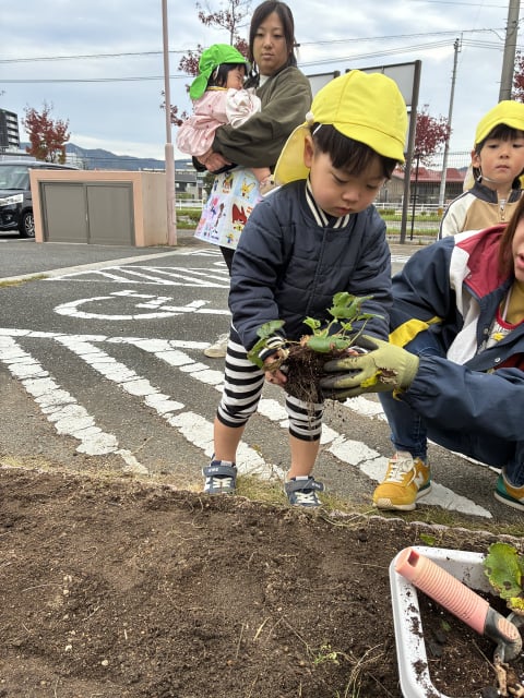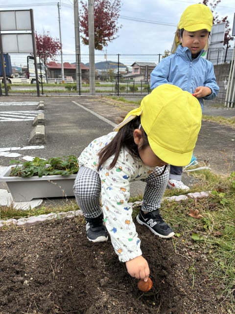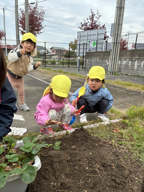 先日いもほりをして、すっきりした畑に、チューリップ🌷の球根とイチゴの苗をぞう組さんが植えてくれました(*^▽^*)