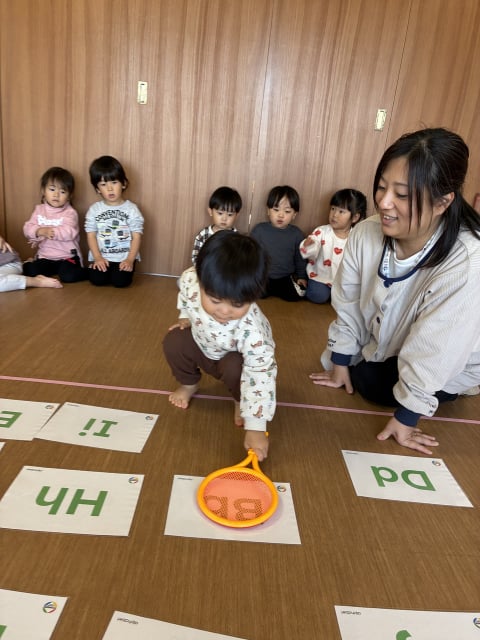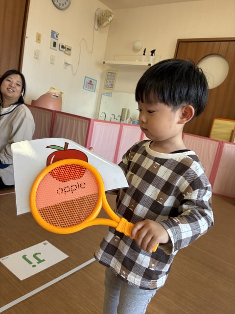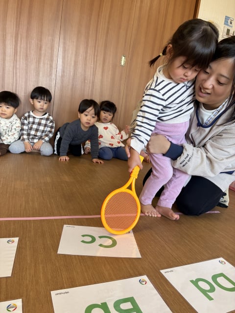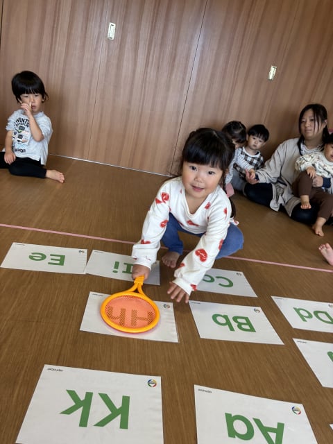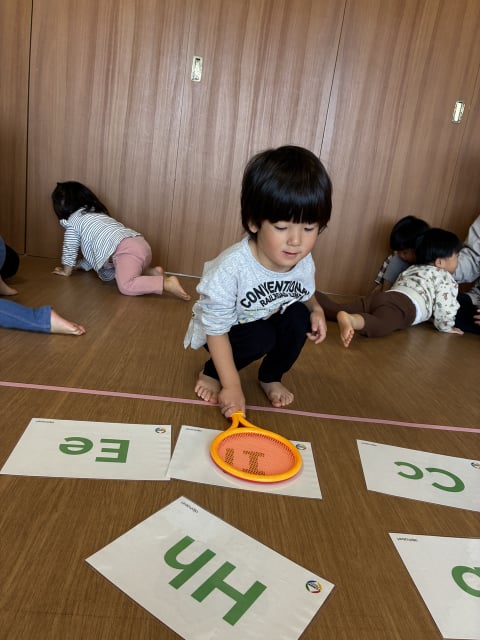 今日のテーマはA-Mのアルファベットです。マイク先生がアルファベットや単語を言うので、子どもたちは床に置かれたフラッシュカードから正しいものをラケットで叩きます。