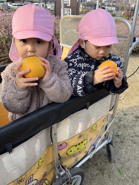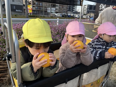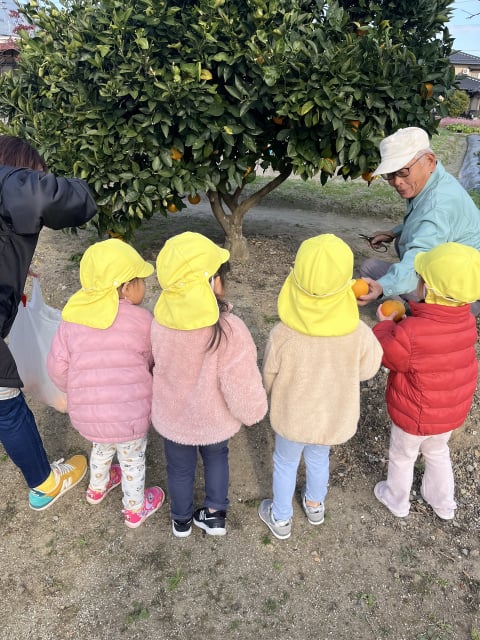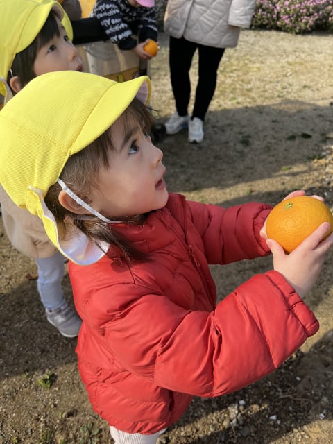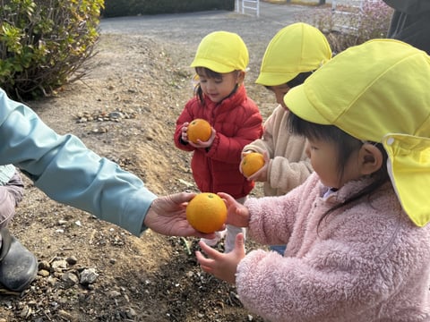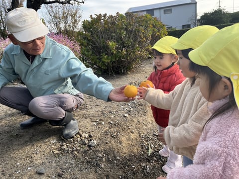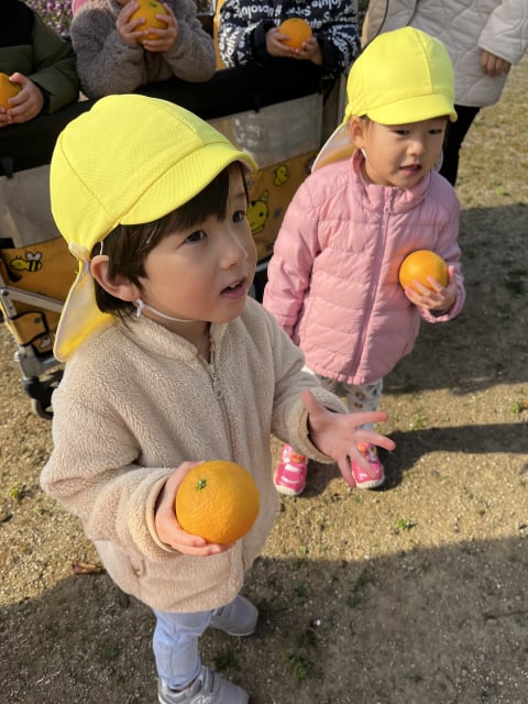 園の周辺をお散歩に出かけると、いつも可愛がってくださる地域の方に会い、なんとなんと子どもたちにミカン🍊を頂きました(*^▽^*)