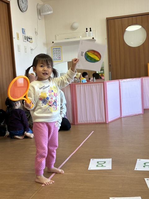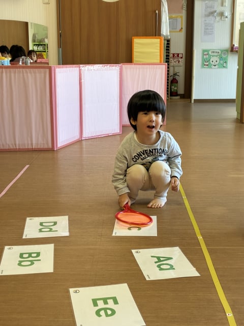 今日のテーマはA-Eのアルファベットです。床にA-Eまでのフラッシュカード文字を上にして並べます。マイク先生が見せる文字と同じフラッシュカードを見つけ、ラケットで叩きます。