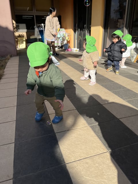 今日はひよこ組さんが裏庭でシャボン玉で遊んでいました(*^▽^*)