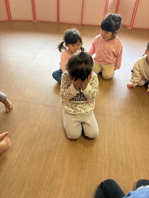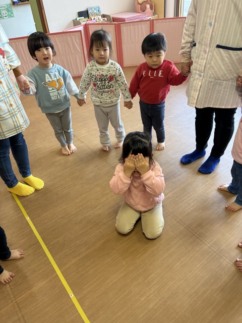 以前は、『僕が鬼が良かった( ;∀;)』『〇〇ちゃんと手を繋ぎたかった( ;∀;)』『抱っこがいい( ;∀;)』などなど・・・から始まり、やっと丸くなったと思ったら、なかなか遊び方が伝わらず、真ん中で寝転がってみたり、みんな中に座ったりと、なかなかの【かごめ】あそびでした(笑)