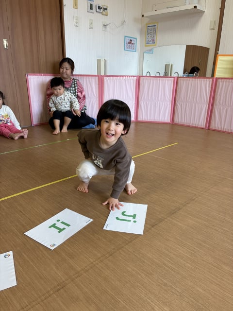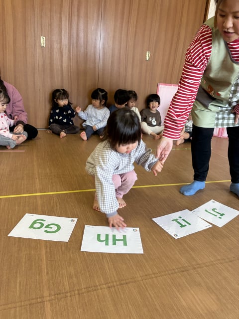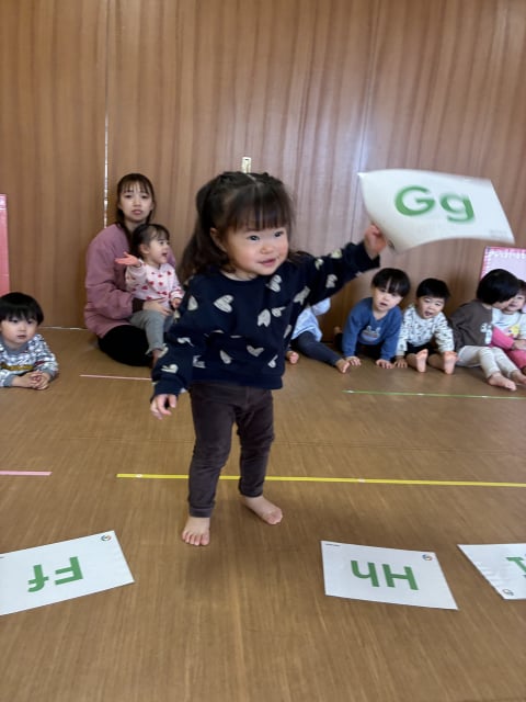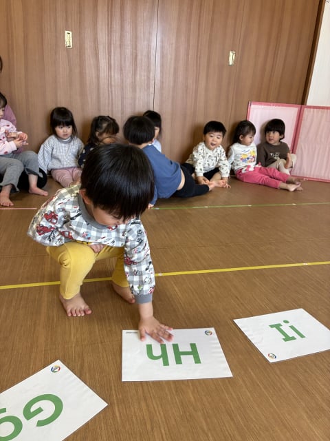 今日のテーマはF-Jのアルファベットです。床にF-Jまでのフラッシュカードを絵を上にして並べます。マイク先生が文字を見せながら該当する単語の真似をする(Gはgorillaですので胸を叩く真似をします)ので、子どもたちは正しいフラッシュカードを探し、触ります。