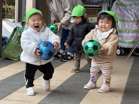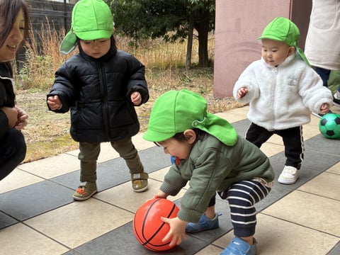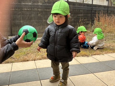 裏庭でボール遊びをしていたひよこ組さん(*^▽^*)